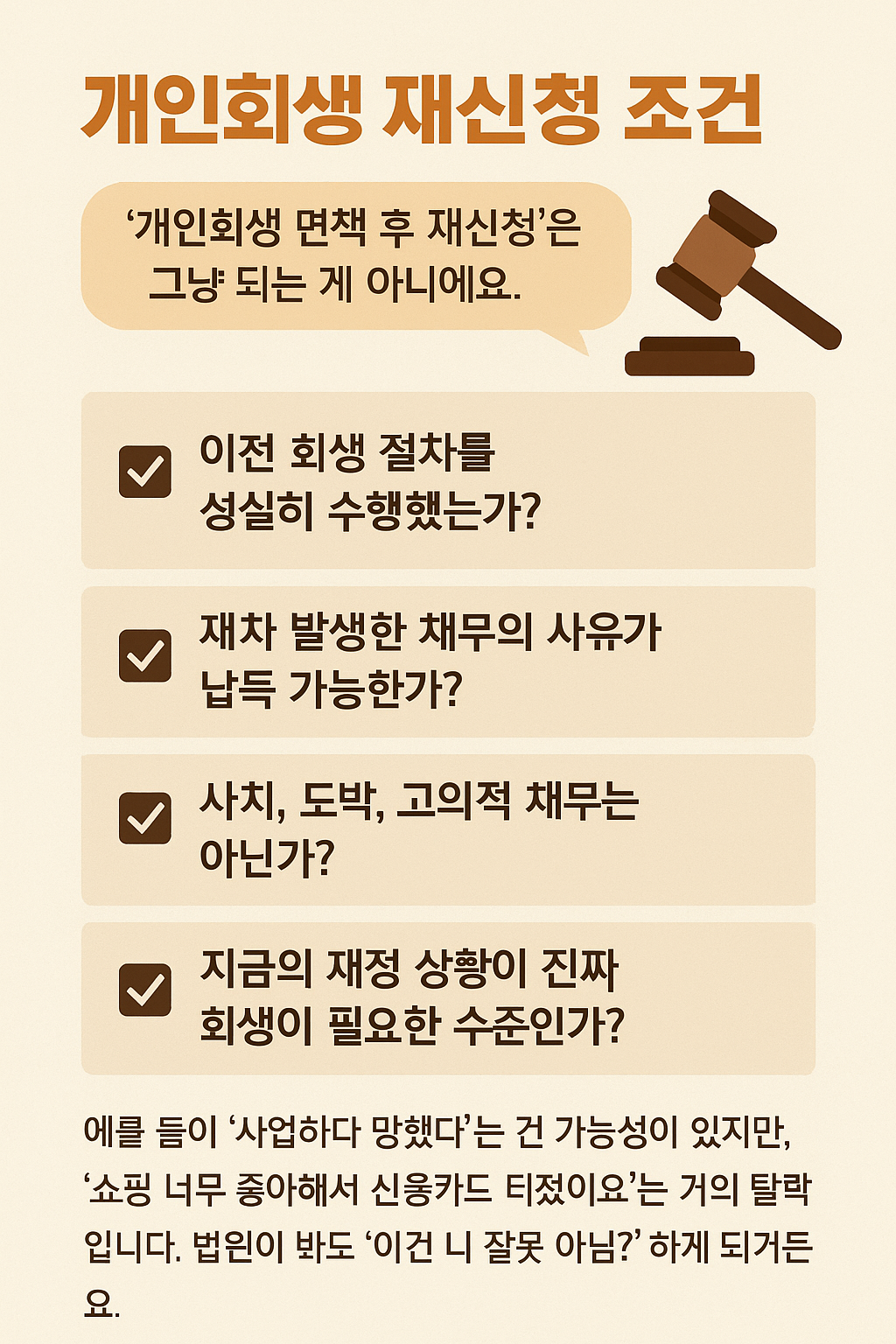 | 필요 조건 | 이전 회생 성실 수행, 재채무 사유 명확 |
